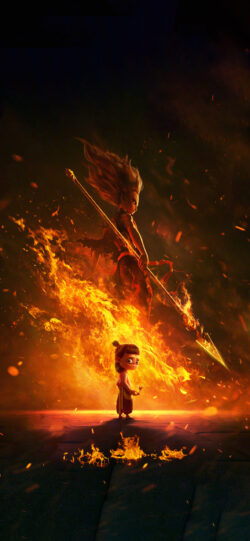 Mythology Hero Fantasy Nezha Uproar in the Dragon Palace Epic Battle Flying Fire Golden Red Streamer Movie Poster Style Art Illustration Epic Feeling